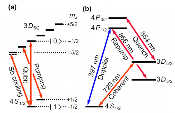 圖2:基于Ca40離子的光學(xué)量子比特方案。S1/2態(tài)到P1/2態(tài)的電偶極躍遷用于多普勒冷卻和熒光探測,S1/2態(tài)到D5/2態(tài)的電四極躍遷用于離子的邊帶冷卻、初態(tài)制備和相干操作。相干操作所需的729nm激光需要具備Hz量級的激光線寬。