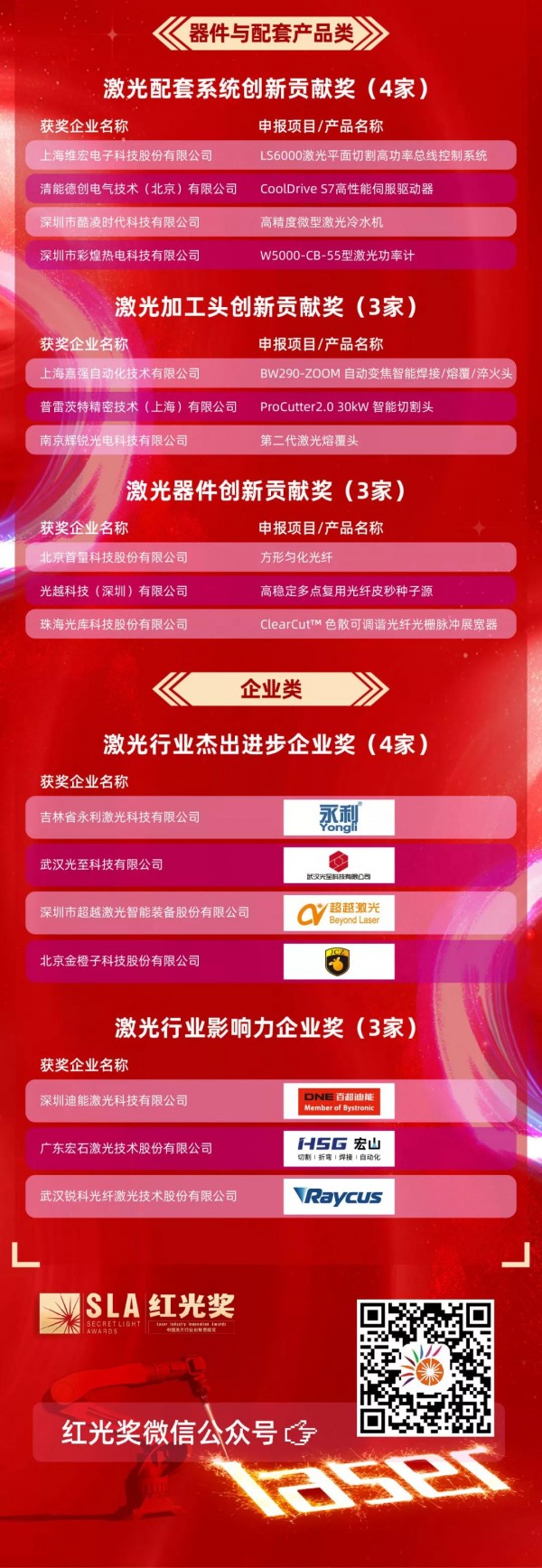 今年的“紅光獎”除了在行業(yè)媒體《激光制造網(wǎng)》開設(shè)專欄,還在2021深圳激光展開辟了入圍及獲獎企業(yè)展示區(qū),全程免費(fèi)為入圍企業(yè)宣傳申報的硬核產(chǎn)品與創(chuàng)新技術(shù),并以此為契機(jī),努力為激光產(chǎn)業(yè)提供一個良好的新品發(fā)布與項目宣講的平臺。本次晚宴的成功舉辦,得到了業(yè)內(nèi)廣大企業(yè)的大力支持,特別是創(chuàng)鑫激光、光惠激光、中久大光、逸飛激光、柏楚電子、華日激光、大族思特、奧徒激光、萬順興、特域機(jī)電、PI、大科激光、科霖環(huán)保等企業(yè)。晚宴現(xiàn)場燈火通明,高朋滿座。風(fēng)云際會間,新朋老友相逢;觥籌交錯間,行業(yè)風(fēng)云翻涌。各位嘉賓度過了一個難忘的夜晚,更與主辦方共同期盼下屆彼此更多的收獲與成功!頒獎晚宴為激光行業(yè)搭起了一座溝通的橋梁,為激光產(chǎn)業(yè)創(chuàng)新發(fā)展再添力量。作為參與企業(yè)多、規(guī)格高、專業(yè)度高的全國性激光行業(yè)獎評選,“紅光獎”正邁入第五個年頭。順應(yīng)激光行業(yè)發(fā)展及新趨勢,主辦方將通過評審打通激光行業(yè)壁壘,打造更具專業(yè)度和影響力的行業(yè)獎項,增強(qiáng)獲獎項目在激光制造全領(lǐng)域的影響力。