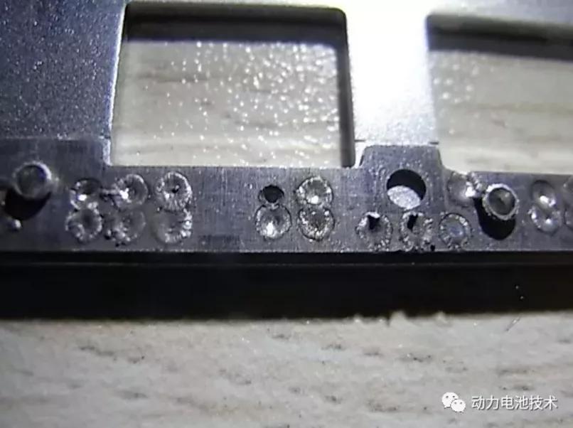 方形電池組合焊接時(shí),極柱或連接片受污染厚,焊接連接片時(shí),污染物分解,易形成焊接炸點(diǎn),造成孔洞;極柱較薄、下有塑料或陶瓷結(jié)構(gòu)件的電池,容易焊穿。極柱較小時(shí),也容易焊偏至塑料燒損,形成爆點(diǎn)。不要使用多層連接片,層之間有孔隙,不易焊牢。