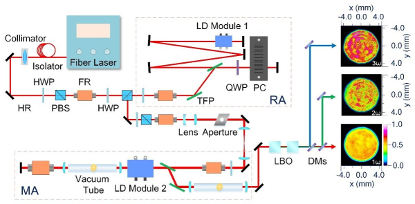 該研究中,紫外激光器由前端可編程種子源、光隔離系統(tǒng)、再生放大器(RA)、光束整形器、主放大系統(tǒng)(MA)、諧波轉(zhuǎn)換單元等部分組成。研究人員通過精確調(diào)控Nd:YAG激光器放大后基頻激光脈沖的時(shí)間波形和空間分布,以提高其時(shí)空填充系數(shù)。120mJ、100Hz的1064nm激光脈沖通過兩塊LBO晶體進(jìn)行三倍頻后獲得了脈沖能量為91mJ、脈寬470ps的355nm激光脈沖,三倍頻轉(zhuǎn)換效率高達(dá)76%,脈沖能量穩(wěn)定性在3小時(shí)優(yōu)于1.07%(RMS),實(shí)現(xiàn)了重頻皮秒固態(tài)激光器中最高三倍頻轉(zhuǎn)換效率。