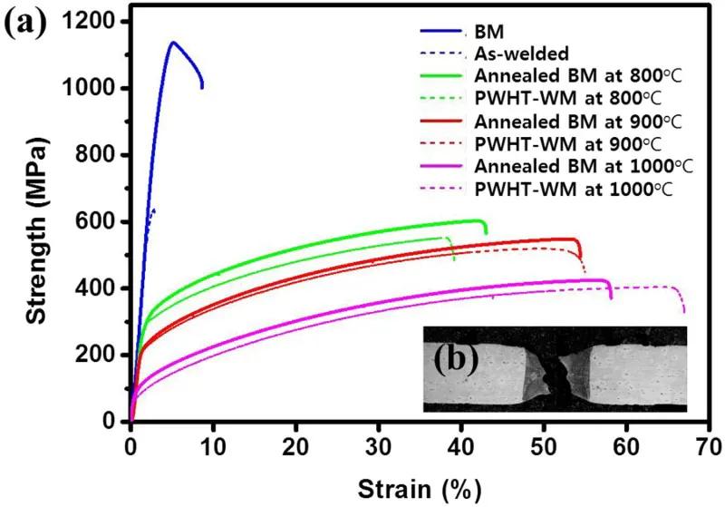 Nam等人顯示CoCrFeMnNiHEA薄片(焊接前同步)的LBW接頭的力學(xué)性能下降。作者將這種退化歸因于顆粒的再結(jié)晶和(可能)焊接條件下通過焊接熱輸入的“位錯(cuò)團(tuán)的消失”。與焊接條件相比,PWHT在800到1000°C之間對延性有積極影響。在退火條件下,HEABM和WM在每個(gè)PWHT條件下的強(qiáng)度和延展性是相似的,盡管與初始條件相比,WM伴隨著抗拉強(qiáng)度的顯著損失。