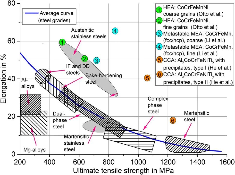 例如,傳統(tǒng)的合金是由冶金的“試錯(cuò)法”誕生的,它由一個(gè)主要元素組成,其中添加少量的合金元素以提高目標(biāo)性能。例如,在鋼或鎳基超合金中的基體元素鐵中加入Cr,以提高強(qiáng)度和耐腐蝕性。銅合金到基礎(chǔ)元素Al,或Al添加到鈦基輕質(zhì)材料中以提高強(qiáng)度。每一種合金都具有典型的性能,如高機(jī)械強(qiáng)度和延性,同時(shí)對最重要的鋼具有高比重量用于結(jié)構(gòu)強(qiáng)度。另一個(gè)例子是,由于其高強(qiáng)度重量比,鋁和鈦合金使得現(xiàn)代飛機(jī)工業(yè)得以發(fā)展。然而,并不總是有可能用傳統(tǒng)的合金概念來提高所有的性能(機(jī)械強(qiáng)度、延展性、特定的合金重量、蠕變、耐腐蝕性等),并且必須找到一個(gè)折衷方案。