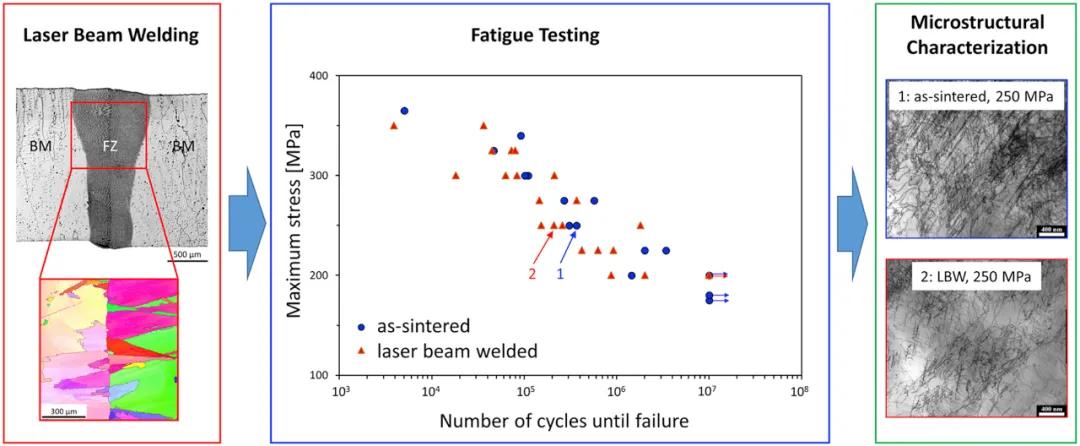 圖6表明,CoCrFeNi類型的高熵合金可以成功的采用激光束來進(jìn)行焊接;析出的碳化物造成熔化區(qū)的硬化;燒結(jié)狀態(tài)和焊接的合金具有相似的靜態(tài)力學(xué)性能和疲勞性能;疲勞斷裂主要發(fā)生在基體材料的區(qū)域中。