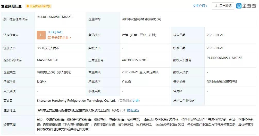 10月21日,大族激光新設(shè)立了一家全資子公司——深圳市漢盛制冷科技有限公司(以下簡稱“漢盛制冷”),注冊資本3500萬元,法人代表為呂啟濤,總經(jīng)理為郭召永。漢盛制冷...