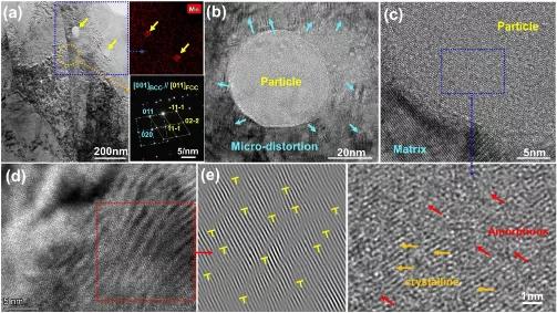 圖 9. 成品樣品的 TEM 顯微結(jié)構(gòu)觀察。(a) BF-TEM 圖像以及所選區(qū)域的 EDS 圖和 SADP,(b) 顆粒的形態(tài),(c) 對(duì)顆粒微觀結(jié)構(gòu)的特寫觀察,所選放大圖像顯示結(jié)晶-非晶復(fù)合材料 結(jié)構(gòu),以及 (d) 粒子周圍畸變的形態(tài),F(xiàn)FT 圖像顯示位錯(cuò)(用“T”標(biāo)記)。