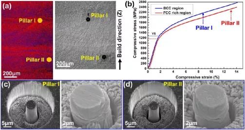 圖 12. 420SS 成品后的微觀力學(xué)性能。(a) 微柱位置的相位分布圖和 OM 圖像,(b) 柱的壓縮應(yīng)力-應(yīng)變曲線,以及 (c) 柱 I 和 (d) 柱 II 壓縮測試前后的 SEM 形貌。