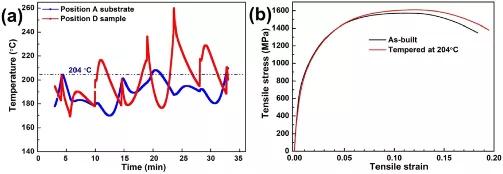 圖 14. 420SS LAAM 的固有回火行為研究。(a) 用兩個(gè)熱電偶在不同位置獲得的實(shí)驗(yàn)時(shí)間-溫度曲線,如圖 1d 所示,以及 (b) 成品和后回火(204°C 2 h)樣品的拉伸性能。