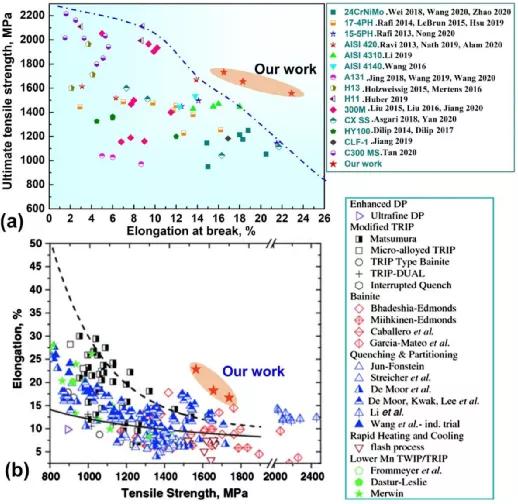 圖 13. LAAM 加工的 420SS 在這項(xiàng)工作中獲得的拉伸性能與 (a) AM 加工的高強(qiáng)度鋼 (HSS) 和 (b) 常規(guī)生產(chǎn)的 HSS 的拉伸性能相比。