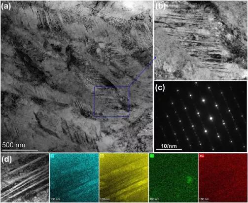 圖 8. HT427 樣品中納米孿晶的微觀結(jié)構(gòu)觀察。(a) BF-TEM 形貌,(b) 納米孿晶的特寫視圖,(c) 對(duì)應(yīng)于 (b) 中區(qū)域的納米孿晶的 SADP,以及 (d) 納米孿晶的 EDS 映射分析。