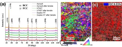 圖 15. (a) XRD 譜顯示了 420SS 樣品在拉伸試驗(yàn)前后的 BCC 馬氏體 (α) 和 FCC 奧氏體 (γ);(b) IPF 和 (c) 接近斷裂位置的成品樣品的相位分布圖。