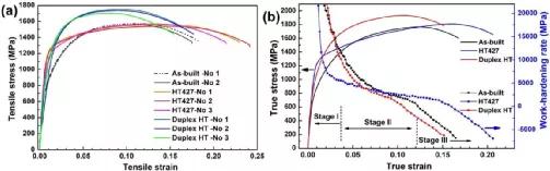 圖 11. LAM 處理的 AISI 420SS 在不同條件下的拉伸性能。(a) 工程應(yīng)力-應(yīng)變曲線,和 (b) 真實(shí)應(yīng)力-應(yīng)變和加工硬化率曲線。