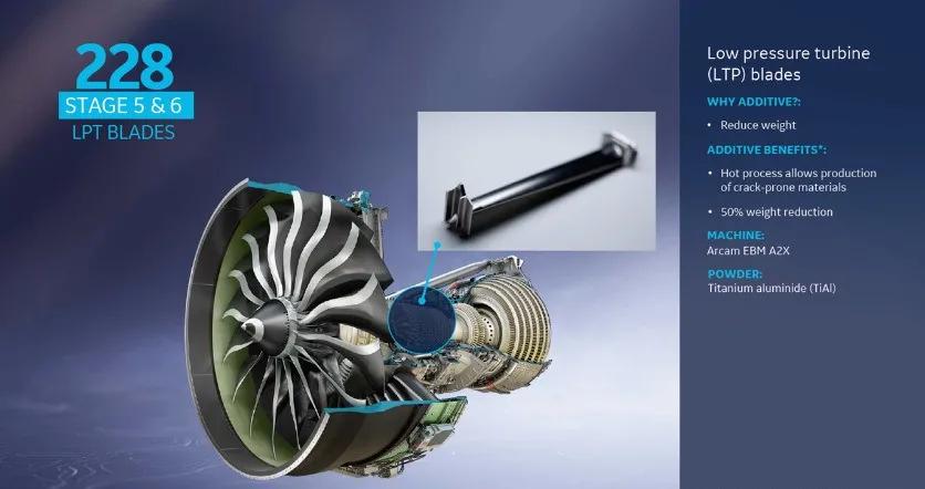 低壓渦輪葉片的材質(zhì)為T(mén)iAl合金,屬于脆性材料,SLM技術(shù)成形此材料極易出現(xiàn)裂紋缺陷,導(dǎo)致生產(chǎn)的產(chǎn)品無(wú)法滿(mǎn)足工程需求,因此選定了適用于脆性材料成形的電子束粉末床技術(shù)制備該型號(hào)葉片。TiAl合金相比傳統(tǒng)的鎳基高溫合金輕50%左右,具有優(yōu)異的比強(qiáng)度,使整個(gè)低壓渦輪機(jī)的重量減少20%,同時(shí)將使GE9X提高了10%的推力,每臺(tái)GE9X發(fā)動(dòng)機(jī)上安裝有228片低壓渦輪葉片。