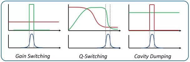 圖 2 用于產(chǎn)生脈沖激光的各種調(diào)制方法的示意圖,其中損耗(紅色)、增益(綠色)和激光輸出(藍(lán)色)為時(shí)間的函數(shù)。