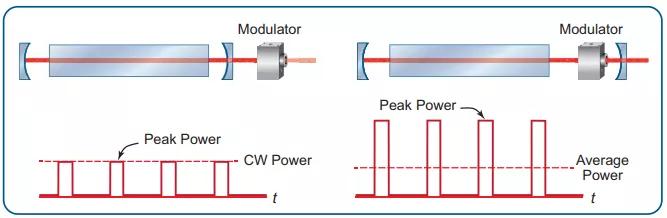 以連續(xù)波模式工作的激光器的輸出功率不隨時(shí)間變化。這是由于激光器達(dá)到了一種激光腔增益(取決于與泵浦速率成正比的粒子數(shù)反轉(zhuǎn))和損耗(包含腔損耗和受激輻射速率)保持平衡的穩(wěn)態(tài)條件。由于能夠顯著提高峰值輸出功率,所以通常希望激光器可以工作在脈沖模式??梢詫⑦B續(xù)激光輸出發(fā)送至外部調(diào)制器來(lái)實(shí)現(xiàn)脈沖激光運(yùn)轉(zhuǎn),調(diào)制器充當(dāng)一個(gè)只在短時(shí)間內(nèi)允許透過(guò)的開(kāi)關(guān)(見(jiàn)圖 1,左)。這種簡(jiǎn)單的方法有許缺點(diǎn)。由于大多數(shù)光被調(diào)制器阻擋,該方法的效率很低。