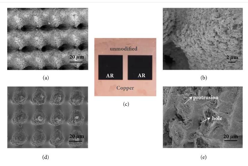 AR表面的表征。(a)表面微圖案和(b)突出物和孔洞表面納米尺度特征的SEM顯微照片。(c)由銅制成的AR表面。(d)樣品沉積后的AR表面。(e)激光多次照射后的AR表面(1 cm2襯底上約106次激光照射)。