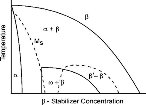 因此,添加它們是為了通過限制滑移變形和位錯(cuò)移動(dòng)來改變合金的性能。α-合金在室溫下具有非常有限的BCCβ相。同樣,α- β合金在室溫下同時(shí)保留了α相和β相。α - β鈦合金中的合金元素在室溫下起到穩(wěn)定劑的作用,使β相保持不變。Β-alloys在冷卻到室溫時(shí),由于β穩(wěn)定元素的作用,易于保持β相。。圖2顯示了β穩(wěn)定劑數(shù)量的增加對(duì)β相室溫穩(wěn)定性的影響,這也與馬氏體起始溫度(Ms)有關(guān)。在此溫度下,BCC(β相)開始轉(zhuǎn)變?yōu)獒槧頗CP(α相)微觀結(jié)構(gòu),稱為馬氏體,并依賴于合金元素。如圖2所示,β-穩(wěn)定劑用量的增加降低了Ms值。
