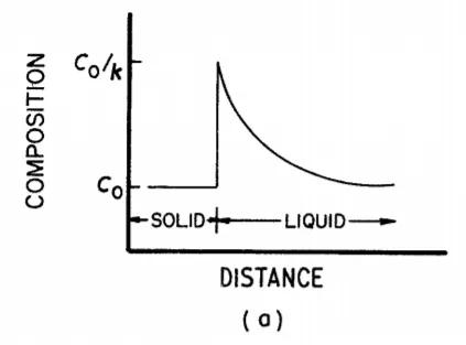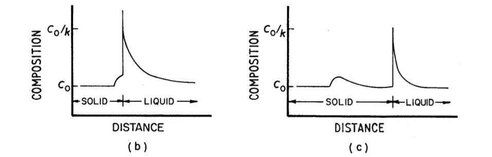 凝固速度增加導(dǎo)致富溶質(zhì)帶形成的示意圖。Co為標(biāo)稱合金成分,k為平衡分配比。(a) 在R~處的穩(wěn)態(tài)凝固,(b)生長(zhǎng)速率從R~增加到R 2,(c)在R 2處的穩(wěn)態(tài)凝固(經(jīng)過Flemings之后)