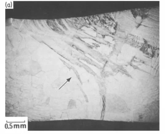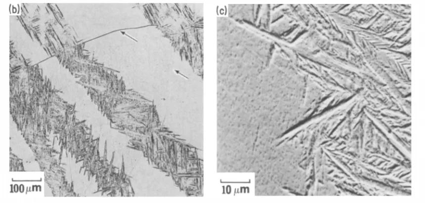 Ti6A1-4V/Ti-15V-3Cr-3A1-3Sn熔焊件的結(jié)構(gòu)特征。(a)顯示Ti-15V-3Cr-3A1-3Sn熔合邊界區(qū)域的光宏圖。大箭頭表示明顯的熔合邊界。(b) 顯示rn'人工轉(zhuǎn)化帶的光顯微照片。(c) 掃描電子顯微照片,顯示轉(zhuǎn)化帶結(jié)構(gòu)和相鄰的β區(qū)。