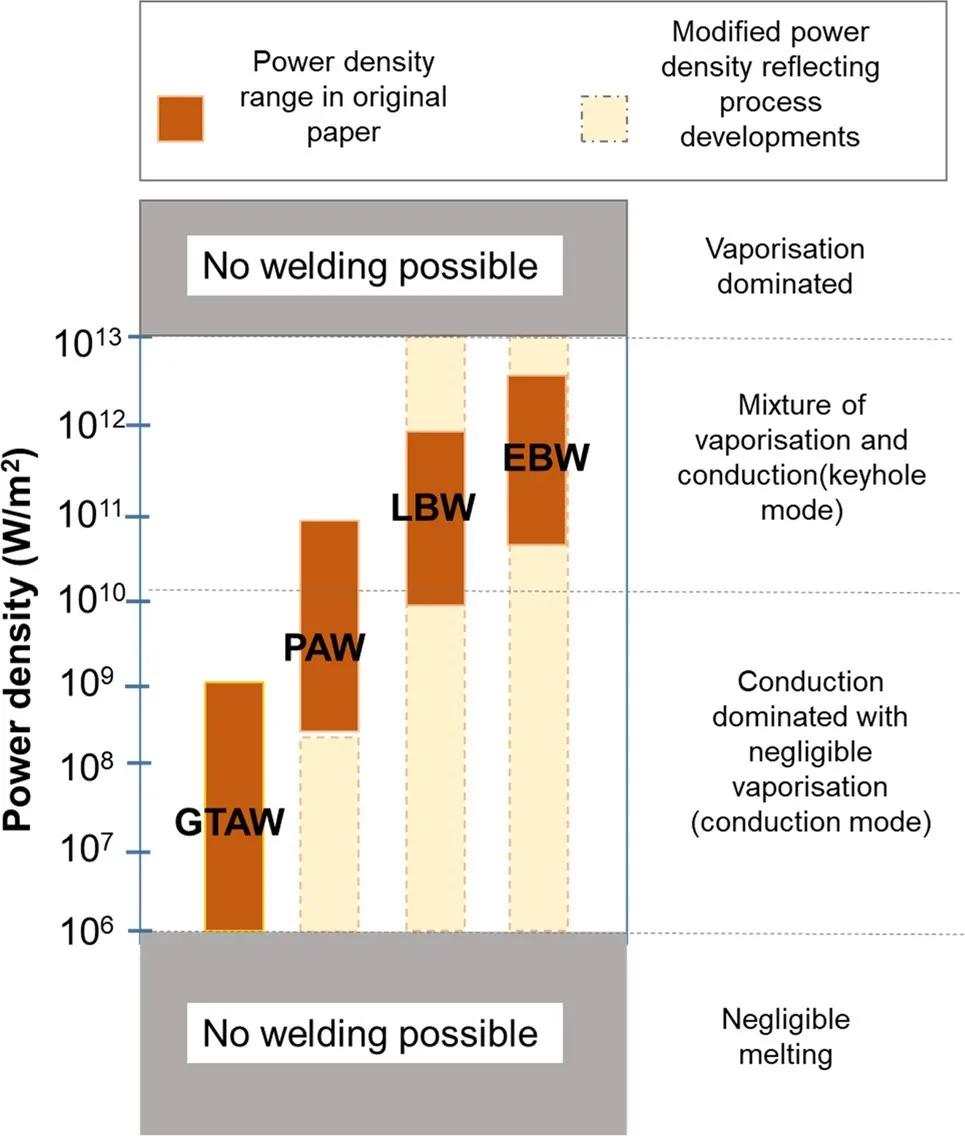 圖3 不同焊接工藝的功率密度,“GTAW”為TIG焊接,“PAW”為等離子弧焊