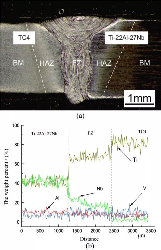 然而,就長(zhǎng)期服務(wù)提供而言,結(jié)構(gòu)完整性可能會(huì)受到影響。特別是,異種合金的焊接可能會(huì)導(dǎo)致焊接接頭界面處的不相容問題,因?yàn)椴牧咸匦圆煌?,如?dǎo)熱系數(shù)、熱膨脹和彈性模量。對(duì)于Ti-6-4/Ti-22Al-27Nb焊接接頭,不同材料的上述性能差異導(dǎo)致元素分布發(fā)生顯著變化,如圖1所示。觀察到元素向基底金屬(BM)區(qū)域的擴(kuò)散很??;但是,熔化區(qū)域受到顯著影響。