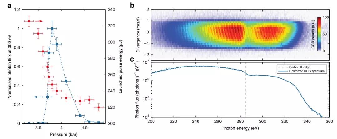 經(jīng)實驗,空芯光纖輸入端氣壓為1 bar,輸出端氣壓3.345 bar時可以獲得較好的結(jié)果:當輸入脈沖能量為265 μJ時,脈沖寬度從100 fs減小到輸出端的20 fs,隨著峰值功率的升高,在脈沖的后段出現(xiàn)電離現(xiàn)象。實驗中通過調(diào)整氣壓和輸入脈沖的方式產(chǎn)生了300 eV的高通量脈沖。圖2(a)展示了最佳輸入脈沖能量和對應(yīng)的最大X射線光通量隨高壓氣室氣壓的變化,縱向誤差來自240次連續(xù)測量的標準差,橫向誤差恒定為氣壓讀數(shù)的不確定度0.1 bar。從圖中可以看到信號光對氣壓敏感,以3.8 bar為中心,10%的氣壓變化將導(dǎo)致光通量變?yōu)樵瓉淼??e^2 ,但模擬可知泵浦光對氣壓不敏感,10%的氣壓變化下脈沖積累的非線性和輸出端峰值功率變化不大,由此證明氣壓梯度主要影響了相位匹配。圖2(b)為最優(yōu)情況下測得的光譜和發(fā)散情況,發(fā)散角約2 mrad,截止能量330 eV,中心對應(yīng)碳原子吸收帶,可能來自光譜儀光柵上沉積的有機污染。圖3(c)為去除碳原子吸收后的光譜,300 eV處光通量超過10^6 s^(-1) (eV)^(-1)。