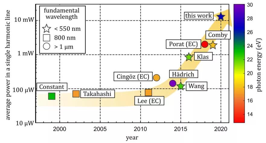 圖3為1999年至今產(chǎn)生12 eV到30 eV(100 nm到40 nm),10 μW以上極紫外光的實驗結(jié)果,縱軸為平均功率,顏色對應(yīng)光子能量,圓形代表泵浦源為中心波長1 μm的摻鐿激光器,方形代表鈦寶石激光器,星型代表對兩種激光器進行二倍頻或三倍頻,EC代表使用了增強腔(enhancement cavity)。驅(qū)動脈沖的脈寬越小、平均功率越高、波長越短,產(chǎn)生的極紫外光通量越大、效率越高、截止能量越高。本文中使用平均功率51 W、中心波長為515 nm、寬度為18.6 fs的驅(qū)動脈沖產(chǎn)生了平均功率12.9 mW、光子能量為26.5 eV的脈沖,效率為2.5×10^(-4),與過去的記錄相比,功率提升了一個數(shù)量級。