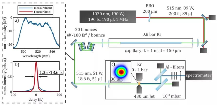 第二篇文章也是利用空芯光纖產(chǎn)生高次諧波,但是產(chǎn)生的是波長更長的極紫外光[2]。與上一篇文章不同,這里的空芯光纖只起到展寬光譜的作用,脈沖壓縮在光纖外進行。