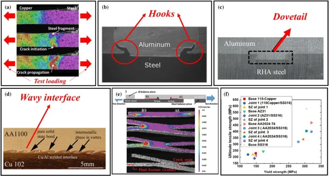 與連接類似材料不同,連接不同材料在機(jī)械載荷期間面臨應(yīng)力集中(彈性模量失配導(dǎo)致的應(yīng)力局部化)的固有問(wèn)題。在銅/鋼接頭(圖11a)和鋁/鋼接頭的拉伸試驗(yàn)期間觀察到應(yīng)力集中。減少早期應(yīng)力集中的有效方法是通過(guò)改變焊接界面的幾何形狀來(lái)重新分配載荷。研究人員引入了機(jī)械聯(lián)鎖特性,如掛鉤或燕尾榫或波浪形金相界面或過(guò)渡區(qū),以提高異種接頭的強(qiáng)度。摩擦攪拌劃線技術(shù)、摩擦攪拌燕尾榫技術(shù)和沖擊焊接的接頭截面分別如圖11b–d所示。吊鉤通過(guò)防止裂紋穿過(guò)焊接界面來(lái)提高異種接頭強(qiáng)度,如圖11e所示。焊縫熔核的局部強(qiáng)度也極大地影響接頭強(qiáng)度,如圖11f所示。基于這些研究,攪拌摩擦劃線技術(shù)和攪拌摩擦燕尾榫技術(shù)顯示了獲得鎂合金/鋼接頭的潛力。除了在不同材料之間添加夾層外,研究人員還可以應(yīng)用摩擦堆焊等技術(shù)來(lái)輔助鎂/鋼粘合。