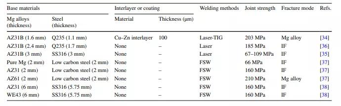 表1和表2分別總結(jié)了焊接鎂/鋼界面上有無(wú)夾層或涂層的界面反應(yīng)產(chǎn)物。根據(jù)表1中總結(jié)的文獻(xiàn),大多數(shù)情況下未觀察到界面產(chǎn)物,但在激光焊接鎂/鋼界面上觀察到金屬氧化物。這是因?yàn)樵谌酆高^(guò)程中容易發(fā)生氧化。金屬間化合物(IMC)出現(xiàn)在FSW-ed鎂和鋼之間的界面上。鎂薄板中的合金元素?cái)U(kuò)散到焊接界面,并與鋼中的鐵反應(yīng)形成各種化合物。例如,AZ31鎂合金中的鋁以及WE43鎂合金中的Y和Nd都可以與鋼中的鐵發(fā)生反應(yīng)。