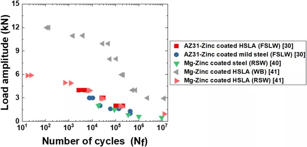 Jana等人研究了攪拌摩擦搭接焊鎂/鋼接頭的循環(huán)荷載行為。為了進(jìn)行比較,對(duì)兩種不同的鋼合金(厚度為0.8 mm的低碳鋼和厚度為1.5 mm的HSLA鋼)進(jìn)行了循環(huán)加載,并繪制了兩者的應(yīng)力與失效循環(huán)次數(shù)(S–N)圖。由于固有強(qiáng)度差異,HSLA wl焊縫(圖10)產(chǎn)生。標(biāo)準(zhǔn)化S–N圖顯示了類似的疲勞行為。與AZ31的文獻(xiàn)相比,疲勞試驗(yàn)試樣在失效時(shí)顯示出明顯較低的載荷振幅。這可能是由于試驗(yàn)方法,即載荷比(R)為0.1以及鎂/鋼焊接界面的存在。AZ31和鋼之間的異種焊縫通常會(huì)導(dǎo)致彎鉤形成,從而增加循環(huán)載荷期間的應(yīng)力集中,從而降低疲勞壽命。