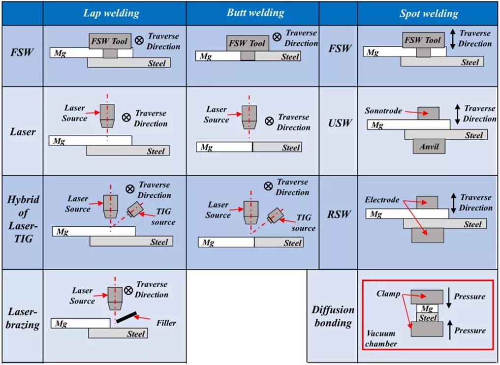 對(duì)于搭接焊,鎂合金板通常放置在鋼板的頂部,焊接功率應(yīng)用于鎂合金。因?yàn)殒V硅合金比鋼具有更低的強(qiáng)度和熔點(diǎn),因此將FSW工具或激光束形式的電源應(yīng)用于頂板,以獲得鎂/鋼接頭。對(duì)于鎂合金和鋼的對(duì)接焊接,出于類似原因,電源應(yīng)用于鎂側(cè)。