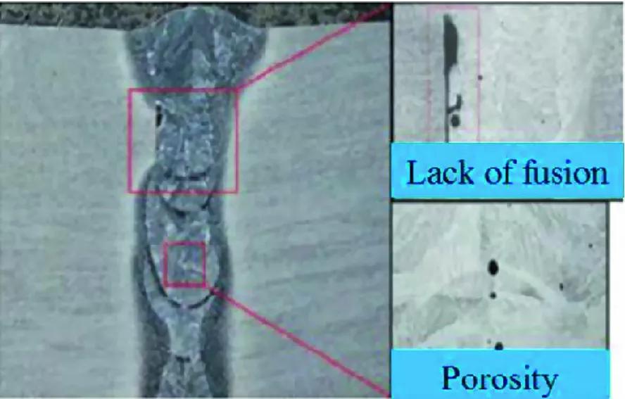 隨著溫度的降低,凝固速率大于氣體的浮動速率,因此,部分氣泡無法從熔池中逸出,然后在焊縫金屬中形成氣孔。氣孔的形成與焊接參數(shù)有很大關系,且在焊接接頭中呈隨機分布。這被稱為冶金孔隙率,與不穩(wěn)定鎖孔產生的孔隙率不同。圖14顯示了激光焊接TC4板的缺陷。