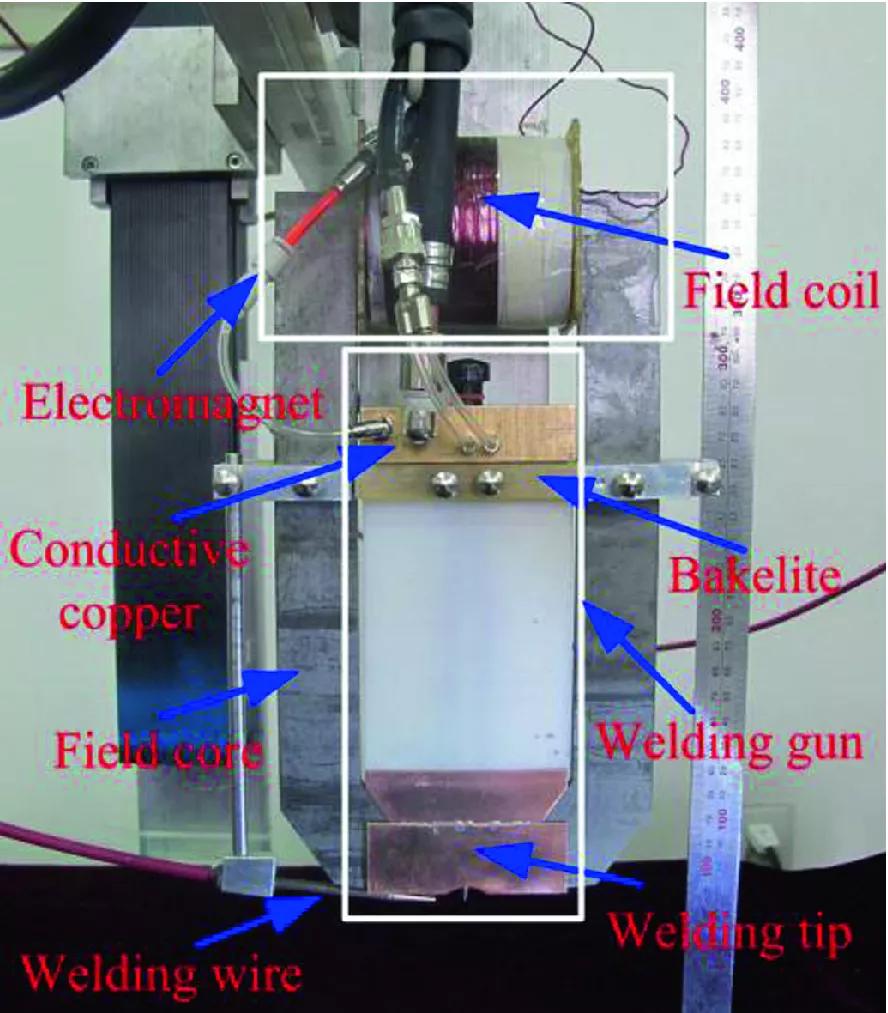 磁場和移動電子的相互作用會產生洛侖茲力,影響焊接電弧形態(tài),從而將熱能分布在坡口側壁上。磁弧振蕩可增加焊縫寬度,側壁熔深明顯增加。1971年,Tseng和Savage首次研究了電磁攪拌,以細化微觀結構并提高力學性能。隨著研究的繼續(xù),他們發(fā)現(xiàn)在窄間隙焊接中引入磁場具有很大的前景。圖3和圖4分別顯示了磁輔助TIG焊炬和電弧特征??梢钥闯?,在磁場作用下,焊接電弧轉移到坡口側壁,這可以抑制側壁的不完全熔合。