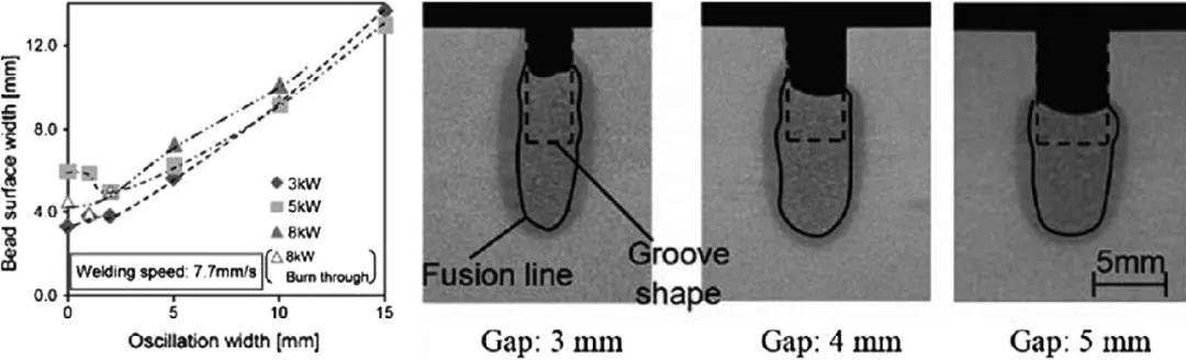 實驗中還研究了激光振蕩焊接及其在窄間隙焊接中的有效性,如圖11所示。通過振蕩激光焊接直接加熱間隙底部附近。然而,一些焊絲碎片可能以固態(tài)形式落入熔池中,導致焊接過程不穩(wěn)定和焊絲成分偏析。當激光束振蕩寬度低于間隙寬度時,可通過間隙的上邊緣(試樣前表面)避免激光束干擾?0.5毫米。