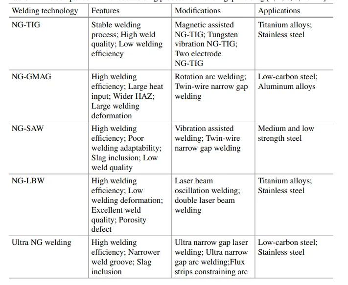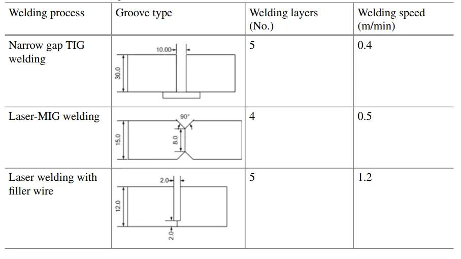然而,對于厚焊接結構,由于微觀結構的不均勻性,機械性能可能沿厚度方向發(fā)生顯著變化,并且已證明受所選焊接工藝參數(shù)和實際接頭幾何形狀的影響。另一方面,高功率電源和真空環(huán)境的要求限制了其實際應用。另一種方法是將低功率電源與填絲窄間隙焊接相結合,以實現(xiàn)多層焊接,這可以調節(jié)焊縫微觀結構并改善接頭性能。該技術具有成本低、焊接生產率高、焊接熱輸入低等特點,被認為是最適合厚板焊接的方法。窄間隙焊接的過程控制和缺陷抑制非常嚴格,以獲得無缺陷接頭。表1比較了厚板焊接各種工藝的焊接特性。