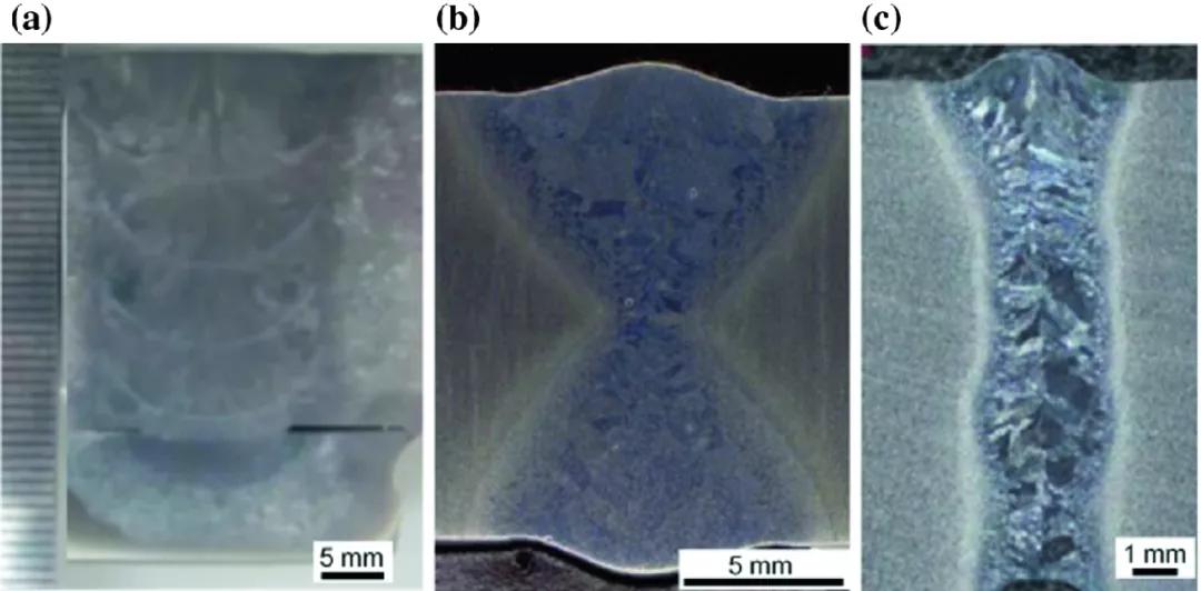圖13 TC4接頭截面:窄間隙TIG焊;b laser-MIG焊接;C激光焊絲焊接