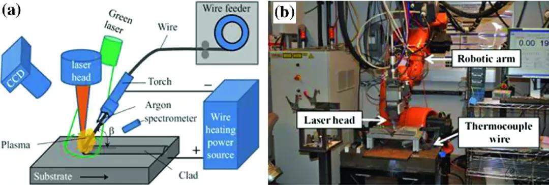 與傳統(tǒng)的弧焊技術相比,激光熱源在厚板焊接中具有許多優(yōu)點,如能量密度集中、焊接速度快、熱影響區(qū)窄、熱變形小。然而,窄間隙激光焊接的一些缺點,如激光光斑小、激光與焊絲/電弧的對準能力差、焊接飛濺等,也亟待解決。熱絲激光焊接實驗系統(tǒng)如圖8所示。