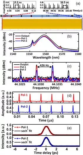 在Pol-1和Pol-2測得的光譜,如圖2(b)所示。 可以觀察到,除了一些小的光譜特征外,它們的光譜形狀非常相似。Pol-1和Pol-2的中心波長分別為1558.9和1558.7 nm左右,相差約0.2 nm。它們的3 dB帶寬也很相似,分別為3.2 nm和3.4 nm,輸出功率分別為635 μW和490 μW。由于不同場分量之間的相干能量交換,在光譜中存在峰/谷對,例如,在1570 nm左右的形狀不同的峰/谷對,是矢量孤子的典型特征。雙脈沖的自相關(guān)跡也由自制的自相關(guān)器測量,如圖2(e)所示。如果假設(shè)脈沖形狀為sech 2 ,則它們的3-dB脈沖寬度分別為約804 fs和713 fs。考慮到光譜帶寬,激光工作在雙矢量孤子狀態(tài),產(chǎn)生兩個偏振幾乎正交的異步矢量孤子序列。