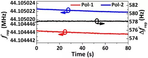 對于許多潛在的雙梳應(yīng)用來說,在重復頻率差異中保持良好穩(wěn)定性的能力是至關(guān)重要的。圖4顯示了監(jiān)控的重復率及其差異。在這種情況下,重復頻率差的頻率為578 Hz。然而,自由運行的激光脈沖重復頻率明顯如預(yù)期的那樣漂移,重復頻率差保持穩(wěn)定,均方根僅為38 mHz。