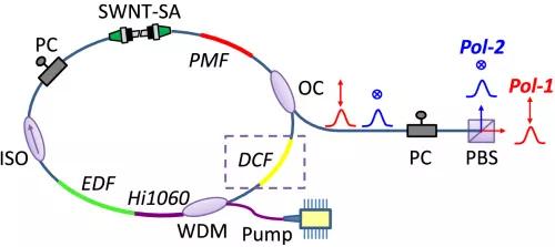 與傳統(tǒng)的標準單模光纖激光器或保偏光纖激光器相比,研究人員采用部分雙折射設(shè)計。圖1所示的雙梳鎖模激光器的設(shè)置包括一個全光纖環(huán)形結(jié)構(gòu),脈沖將在腔內(nèi)通過完全共徑路徑傳播而不是部分共享路徑。為了實現(xiàn)雙梳激光,研究人員在環(huán)形中放置一段保偏光纖(長度為0.30 m,拍長約為4 m),這將引入一些有限但相當大的雙折射,導致不同偏振狀態(tài)的脈沖具有顯著的群速度差異,對同時形成多個異步矢量孤子起著至關(guān)重要的作用。其余部分由0.38 m長的摻鉺光纖(Fibercore Er110)組成,由一個980 nm泵浦二極管通過波分復用器向前泵浦,在激光腔中有一個0.31 m長的Hi-1060尾纖。采用偏振無關(guān)隔離器和偏振控制器分別保證單向運行和控制偏振演化。利用光學沉積法制備的單壁碳納米管飽和吸收體實現(xiàn)了鎖模。雙梳由光耦合器耦合出激光器。對于激光輸出的偏振分辨測量,在偏振控制器之后使用偏振分束器將光分成兩臂,分別表示為Pol-1和Pol-2。偏振控制器用于調(diào)整輸出的偏振狀態(tài)與偏振分束器軸的對齊。