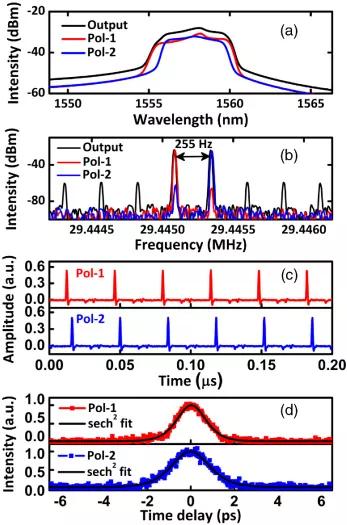 除了上述的雙梳光纖激光器方案外,偏振多路復用輸出的激光源還可以在相同的光譜窗口內(nèi)產(chǎn)生正交偏振態(tài)的雙脈沖。與目前主要研究的雙梳應(yīng)用的雙波長單腔雙梳源相比,它的輸出可以是光譜相干的,沒有固有的帶寬限制。由于保偏光纖激光器發(fā)出的光只有一個偏振,人們對由標準單模光纖組成的傳統(tǒng)鎖模光纖激光器產(chǎn)生的脈沖的偏振狀態(tài)進行了大量的研究。研究表明,在具有弱腔內(nèi)雙折射(由腔內(nèi)殘余光纖/分量雙折射引入)的光纖激光器中,在反常凈腔色散和正常凈腔色散下分別可以產(chǎn)生矢量孤子和耗散矢量孤子。此外,研究人員還觀測到多個偏振正交的矢量孤子的同步振蕩,可能是由于激光的空間增益燒空效應(yīng)造成的 。