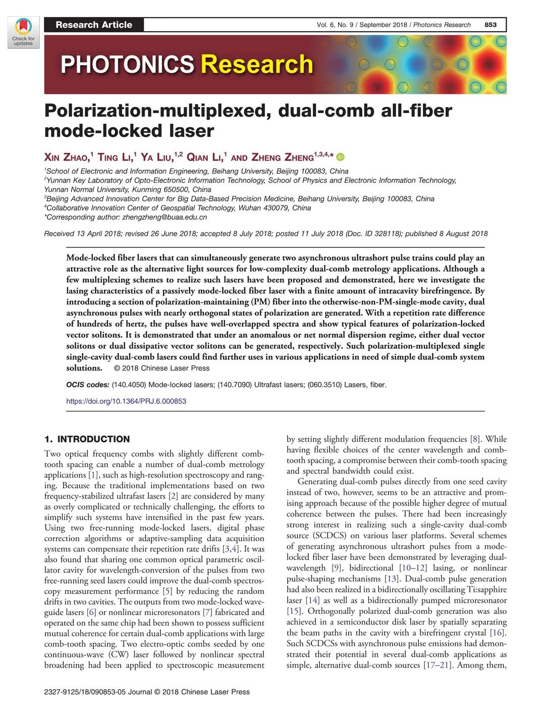 Xin Zhao, Ting Li, Ya Liu, Qian Li and Zheng Zheng, Polarization-multiplexed, dual-comb all-fiber mode-locked laser, Photonics Research 6(9): 853-857 (2018).