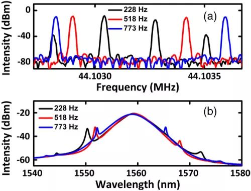 此外,通過調(diào)整腔內(nèi)偏振控制器,可改變重復頻率差。 圖3顯示了重復頻率差從228 Hz調(diào)諧到773 Hz時的射頻和光譜。 考慮到隔離器等元件引入的雙折射的存在,重復頻率差的調(diào)諧主要是由于腔內(nèi)復合雙折射的變化造成的。 這也可以看作是光譜上兩個側(cè)峰的位置相應(yīng)移動。 值得注意的是,當偏振控制器調(diào)整到更低的重復頻率差時,雙梳激光將停止,只留下一個脈沖序列振蕩。