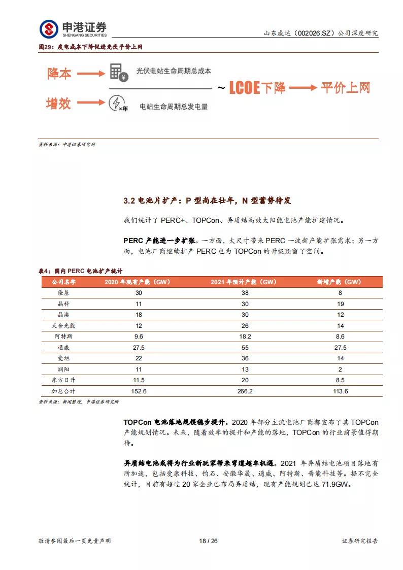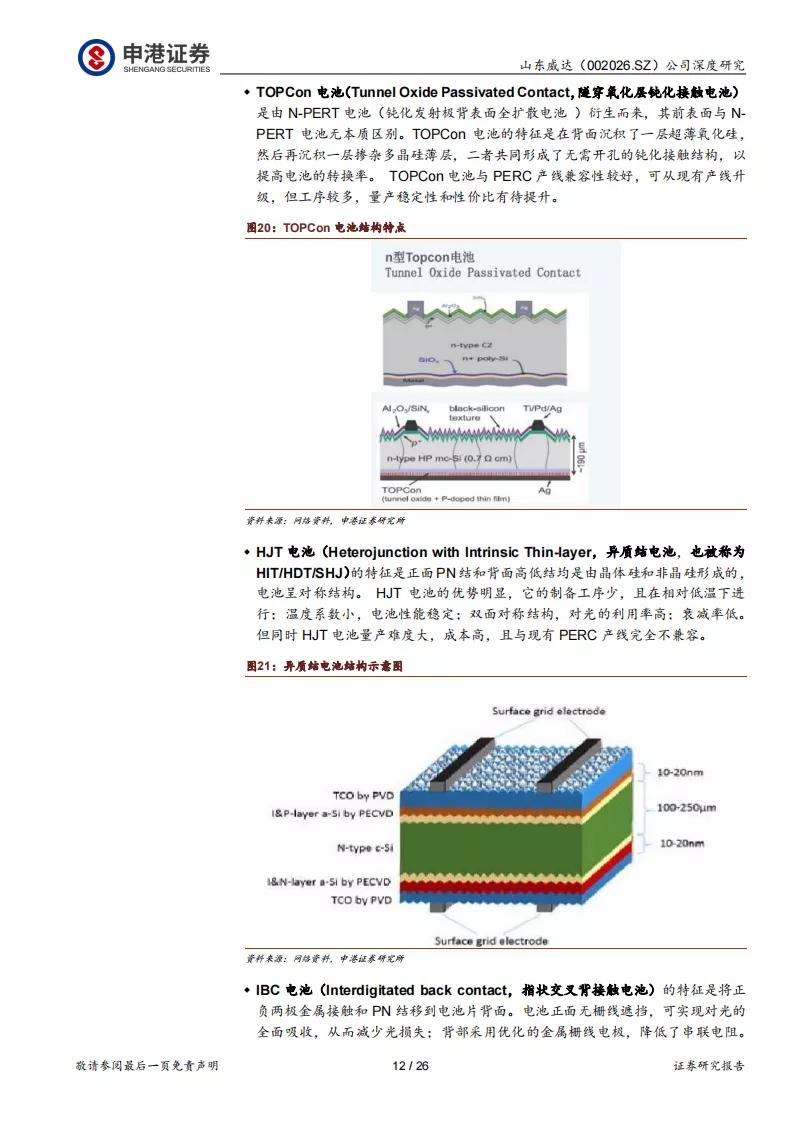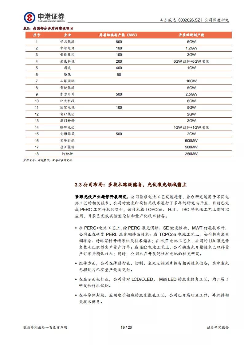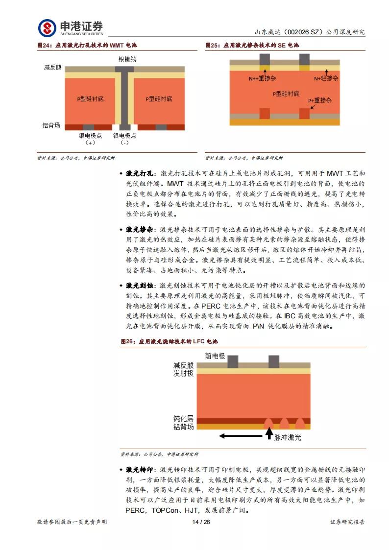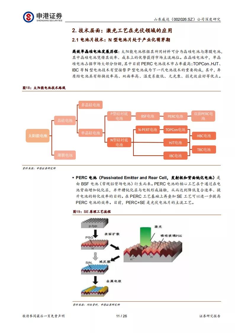 行業(yè)層面:光伏成長空間廣闊激光設(shè)備大有可為。2020 年,我國正式提出力爭在 2030 年前實現(xiàn)碳達峰、在 2060 年前實現(xiàn)碳中和的目標。預(yù)計在碳中和的背景下,整個新能源行業(yè)都將進入高速發(fā)展的快車道.. 中國光伏行業(yè)協(xié)會預(yù)計“十四五”期間,中國年均新增裝機有望達 70-90GW,全球有望達 222-287G。我們分別統(tǒng)計了 PERC、TOPCon、異質(zhì)結(jié)電池擴產(chǎn)情況,從商用角度看,P型電池尚在壯年,N 型電池蓄勢待發(fā),公司在 P 型電池時代創(chuàng)造的市占率神話有望在即將到來的 N 型電池時代得以復(fù)制。公司對激光轉(zhuǎn)印相關(guān)技術(shù)進行了多年的研究與開發(fā),目前已完成 PERC 工藝樣機的交付,該技術(shù)在 TOPCon、HJT、 IBC 等電池工藝上均將大有所為。在 TOPCon 電池工藝上,公司擁有激光硼摻雜、特殊漿料開槽等相關(guān)技術(shù)儲備;在 HJT 電池工藝上,公司的 LIA激光修復(fù)技術(shù)已取得客戶量產(chǎn)訂單;在 IBC 電池工藝上,公司的激光開槽技術(shù)已取得量產(chǎn)訂單并確認收入。