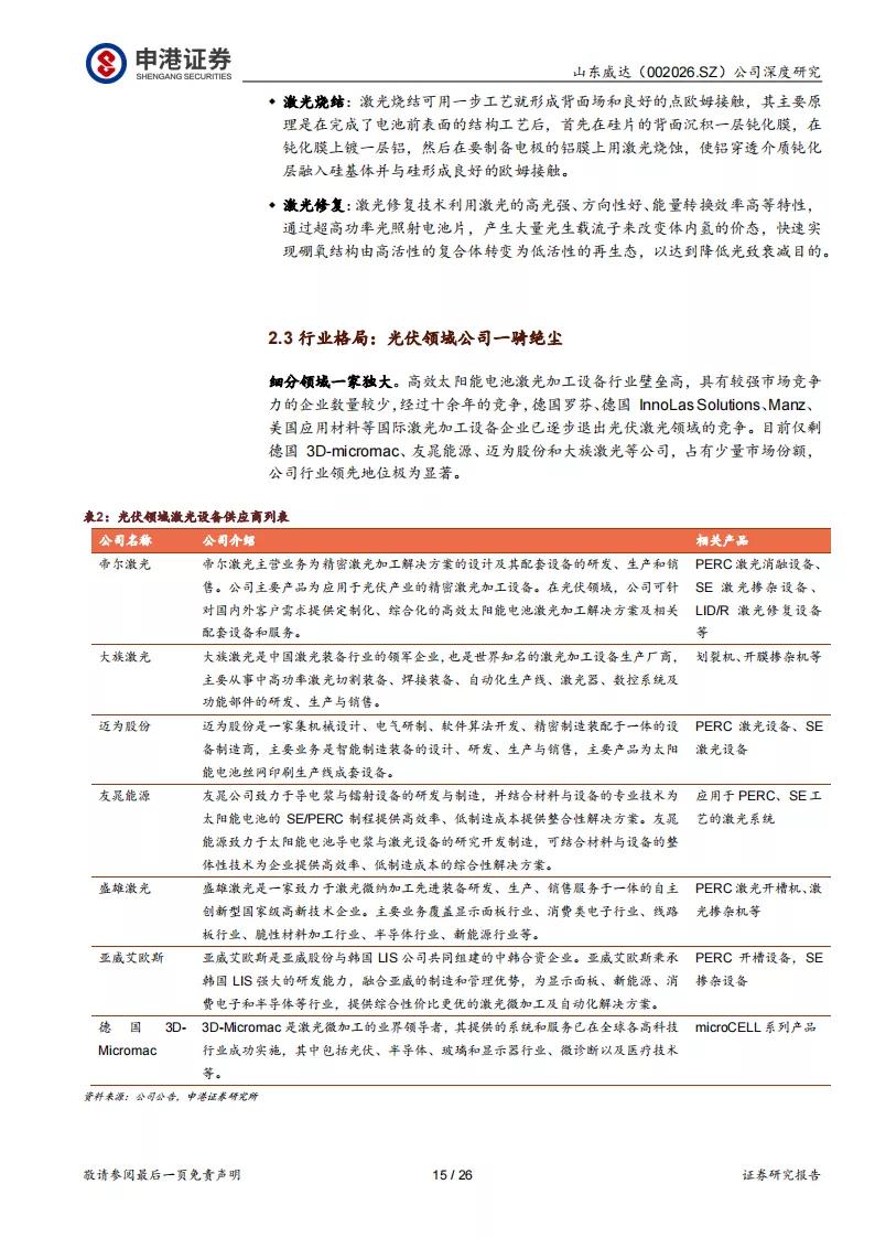 技術(shù)層面:激光工藝在光伏領(lǐng)域的應(yīng)用。太陽能電池根據(jù)其所用材料可分為晶硅電池與薄膜電池,其中晶硅電池憑借其效率、成本上的優(yōu)勢獲得市場主流地位。在光伏領(lǐng)域,激光技術(shù)應(yīng)用廣泛,在各個生產(chǎn)環(huán)節(jié)上均有其用武之地,目前主要包括消融、切割、刻邊、摻雜、打孔、激光修復(fù)、激光劃片等工藝中的應(yīng)用。高效太陽能電池激光加工設(shè)備行業(yè)壁壘高,經(jīng)過十余年發(fā)展,德國羅芬、德國 InnoLas Solutions、Manz、美國應(yīng)用材料等國際激光加工設(shè)備企業(yè)逐步退出。目前,德國 3D-micromac、友晁能源、邁為股份、大族激光等公司占有極少量市場份額,公司行業(yè)地位優(yōu)勢極為顯著。
