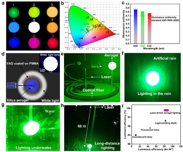 精細調(diào)控的氧化硅氣凝膠可用于不同波長的激光散射。作者基于三基色激光器和商業(yè)熒光粉實現(xiàn)了包括白光在內(nèi)的任意顏色照明,并且照度均勻度高于國際標(biāo)準(zhǔn)化組織對室內(nèi)工作場所照明的要求。由于氣凝膠的超疏水性和激光的準(zhǔn)直性,其可進一步應(yīng)用于雨中、水下和遠距離非接觸式激光驅(qū)動照明,也可利用光纖實現(xiàn)激光跨越障礙物照明。