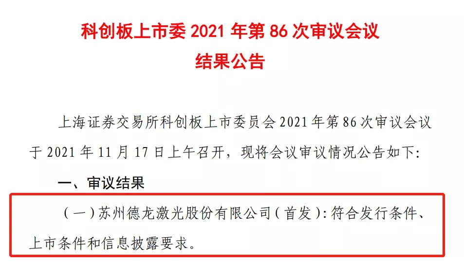 上海證券交易所科創(chuàng)板上市委員會(huì)2021年第86次審議會(huì)議結(jié)果公告披露,蘇州德龍激光股份有限公司(首發(fā)):符合發(fā)行條件、上市條件和信息披露要求。