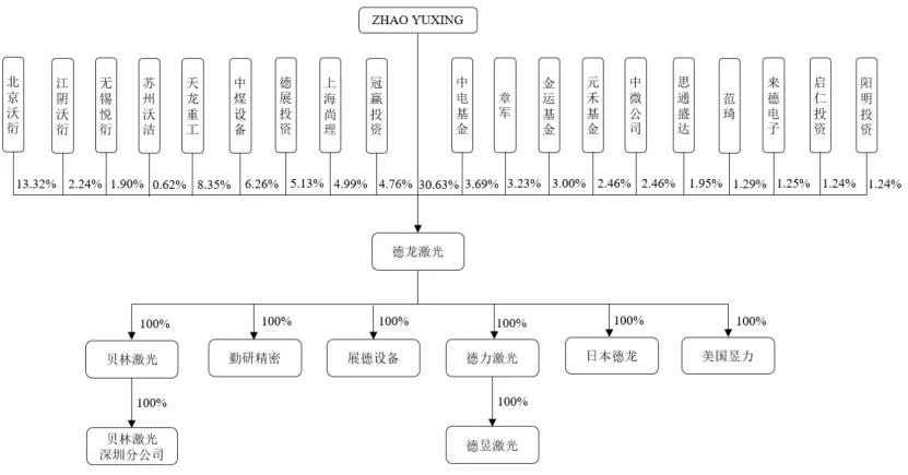 截至招股說(shuō)明書簽署日,德龍激光的股權(quán)結(jié)構(gòu)如下圖所示。本次發(fā)行前,ZHAO YUXING直接持有公司30.63%的股份,為公司的控股股東和實(shí)際控制人。
