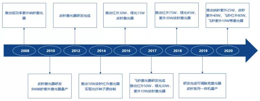 2008年,公司研發(fā)完成納秒激光器,目前納秒紫外激光器功率達(dá)到25W。2012年,公司研發(fā)完成皮秒激光器,目前紅外輸出功率達(dá)到100W,綠光輸出功率達(dá)到50W,紫外輸出功率達(dá)到40W。2017年,公司研發(fā)完成飛秒激光器,目前紅外輸出功率達(dá)到80W,綠光輸出功率達(dá)到40W,紫外輸出功率達(dá)到10W。2019年,公司研發(fā)完成可調(diào)脈寬激光器,目前脈寬可調(diào)范圍200ps-200ns,紅外輸出功率達(dá)到50W。