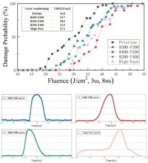 R-on-1激光對(duì)不同時(shí)間形狀DKDP晶體進(jìn)行激光調(diào)理前后的損傷閾值。來(lái)源:SIOM